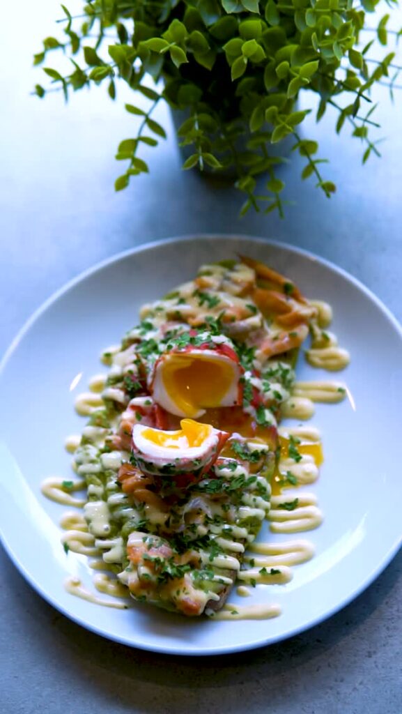 Sliced smoked salmon, smashed avocado, mixed