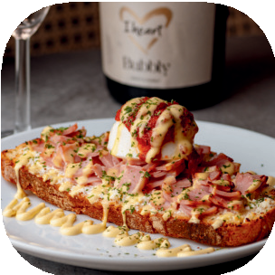 Toasted pugliese breadWith ham, baked poachedEgg,